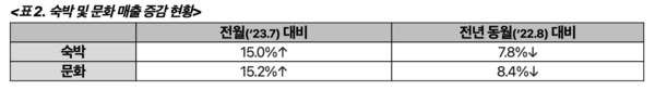 <표 2>에 따르면 무더위를 피하고 휴식을 즐길 수 있는 숙박 매출은 전월 대비 15% 상승했다. 또한 학기 시작 전 남은 방학을 즐기기 위해 영화관, 공연장을 찾는 고객 증가 등으로 인해 문화 매출이 전월 대비 15.2% 증가한 것으로 분석됐다.