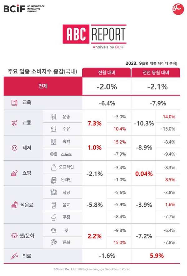이번에 발행된 ABC 리포트’ 8호에 따르면 전월(8월) 발생된 국내 주요 업종에서의 전체 매출은 전월 대비 2.0% 감소했고, 전년 동월 대비 매출 역시 2.1% 감소한 것이 확인됐다. 코로나19 시점(20년8월) 대비 매출은 8.0% 증가했다.