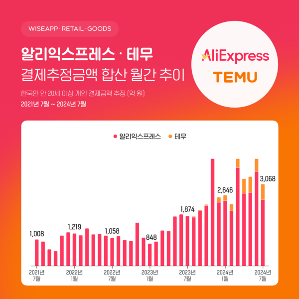 와이즈앱·리테일·굿즈가 만 20세 한국인이 신용카드, 체크카드, 계좌이체, 소액결제 등으로 결제한 금액을 표본조사한 결과, 알리익스프레스와 테무의 7월 결제추정금액은 각각 2,479억 원과 588억 원을 기록했으며 합산 결제추정금액은 3,068억 원으로 작년 동월 1,874억 대비 64% 증가한 것으로 조사됐다.