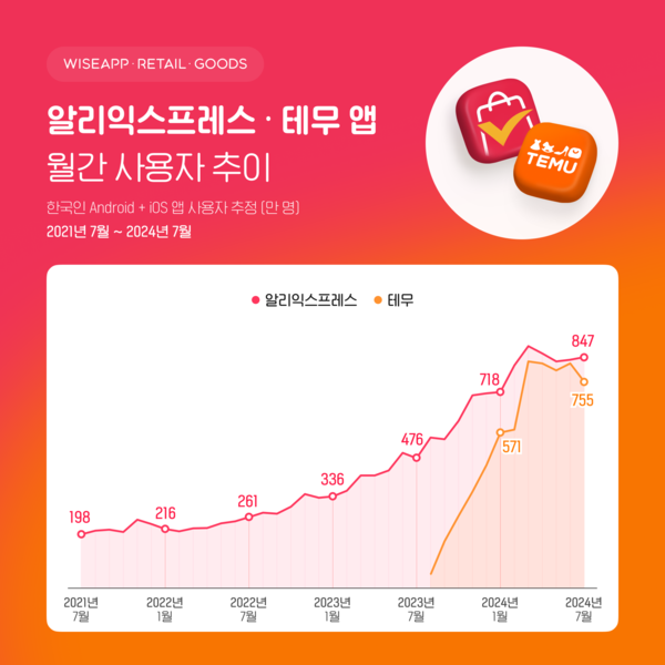 올해 7월 알리익스프레스와 테무 앱의 월 사용자 수는 각각 847만 명과 755만 명으로, 작년 동월 대비 236% 증가한 1,601만 명을 기록했다.