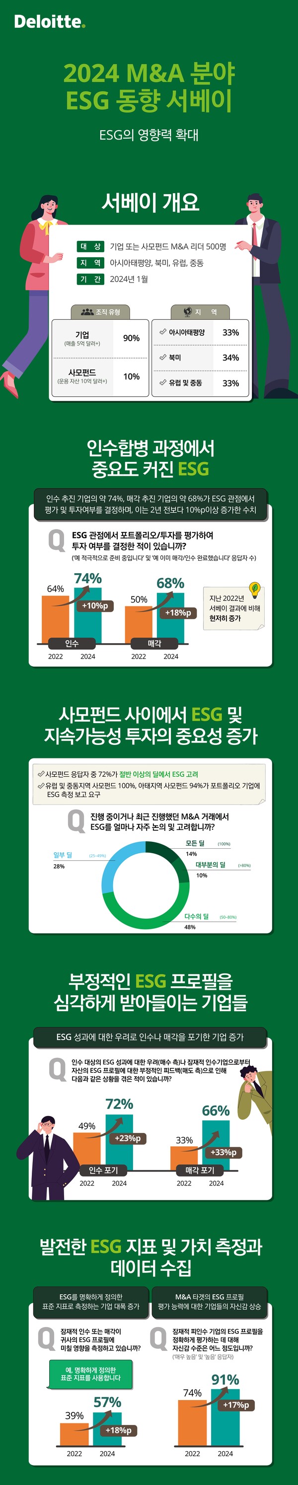 기업 인수합병(M&A) 시장에서 ESG (환경·사회·지배구조) 중요성이 커지는 가운데 한국 딜로이트 그룹이 2024년 1월 북미, 유럽 및 중동, 아시아-태평양 지역에서 매출 5억달러 이상의 기업 또는 운용 자산 10억달러 이상의 사모펀드에 재직 중인 M&A 리더 500명을 대상으로 실시한 설문조사 결과를 담은 ‘2024 M&A 분야 ESG 동향 서베이’를 발표했다.
