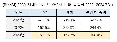 올해 야구 관련서 판매 급증에는 2030 세대의 공이 컸다. 전체 구매자 중 2030 세대 비율은 5년 전(2019년)과 비교해 약 13%p 증가했고, 전년 대비 구매량은 166.8% 상승했다. 특히 ‘여성 팬’의 활약이 두드러지며, 2030 여성의 구매량은 177.7% 급증했다.