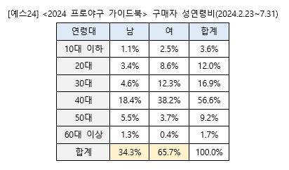 야구 관련 베스트셀러 1위와 2위에는 82세 현역 야구 감독 김성근의 60년 야구 인생을 총망라한 에세이 <인생은 순간이다>, 야구 팬들을 위한 종합 안내서 <2024 프로야구 가이드북>이 올랐다. 특히, 경기장을 찾는 여성 팬들의 관심을 증명하듯 <2024 프로야구 가이드북> 여성 구매자의 비율은 남성 대비 31%p 가량 높은 수치를 보였다.