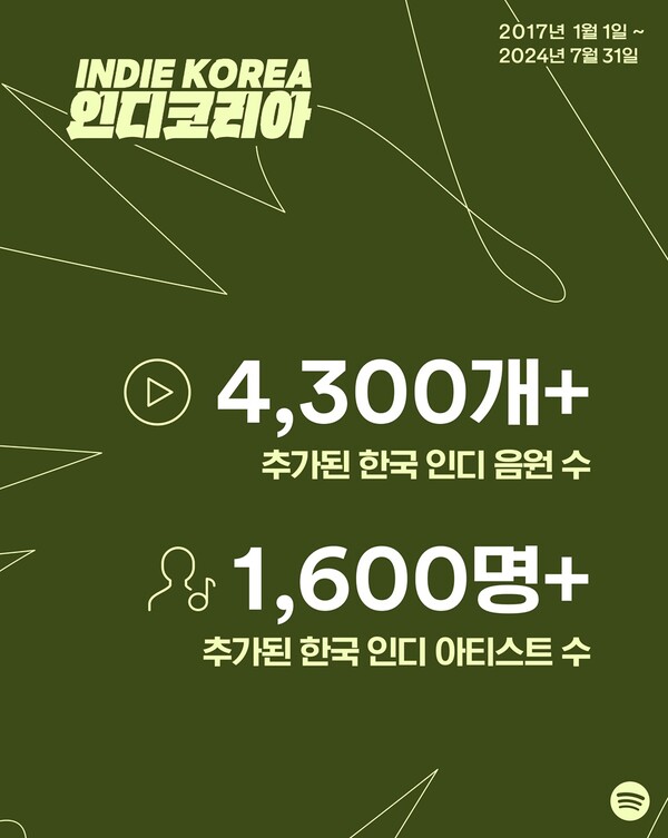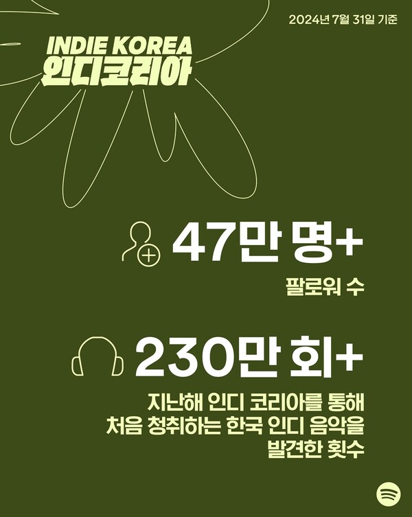 스포티파이는 이번 리브랜딩을 기념해 인디 코리아 플레이리스트와 관련된 주요 스트리밍 데이터를 공개했다. 현재 47만 명 이상의 팔로워를 보유한 인디 코리아 플레이리스트는 지난 7년간 4,300 곡 이상의 한국 인디 음악과 1,600명이 넘는 한국 인디 아티스트를 전 세계 스포티파이 리스너들에게 소개해왔다.