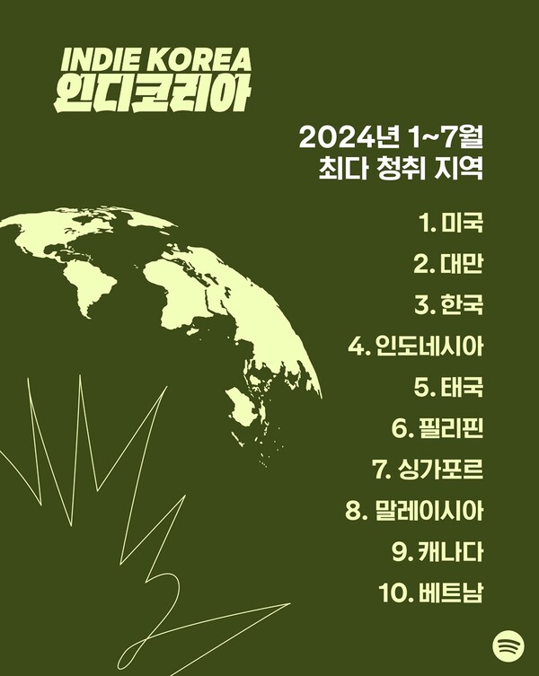 플레이리스트 통해 처음 청취하는 한국 인디 음악 발견한 횟수 연간 230만 회 이상에 달해, 올해 1월부터 7월까지 최다 청취한 지역은 미국, 대만, 한국, 인도네시아, 태국 순으로 나타나