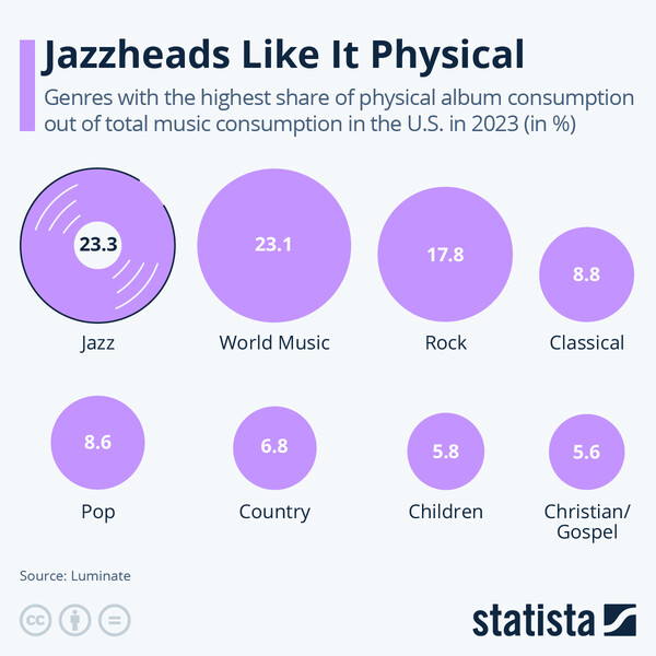 Luminate 데이터를 기반으로 시각화한 스태티스타 차트에 따르면, 물리적 미디어가 가장 큰 점유율을 차지한 음악 장르는 23.3%의 음악 소비 점유율의 재즈였다. 그 뒤를 이어 월드 뮤직이 23.1%, 록이 약 18%로 각각 2위와 3위에 올랐다.