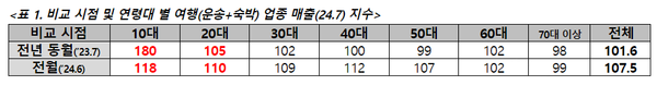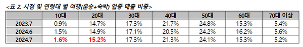 7월에 발생된 여행(운송∙숙박) 매출은 전년 동월(1.6%↑) 및 전월 대비(7.5%↑) 모두 증가했고, 이 중 20대 이하 고객이 매출 증가세를 주도한 것이 확인됐다.(표 1. 참고)