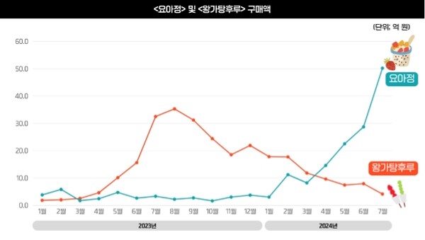 반면, 탕후루와 상반된 흐름을 보이고 있는 ‘요거트 아이스크림의 정석(요아정)’의 성장세가 눈에 띈다. 2024년 2월 요아정 구매액은 11.2억원으로 전월(1월) 대비 272.4% 증가한 것으로 나타났다. 이후 급격한 상승세를 보이면서 7월에는 무려 1569.9%의 신장률을 기록해, 전년도 왕가탕후루의 구매액을 뛰어넘는 성과를 보인 것으로 확인됐다. 개인의 다양한 취향을 반영할 수 있는 커스터마이징 옵션과 SNS를 통해 확산된 인플루언서 마케팅이 주요한 역할을 한 것으로 풀이된다. 실제로 최근 SNS를 중심으로 ‘요아정 픽(Pick)’, ‘요아정 꿀조합’ 등의 레시피가 공유되면서 ‘나만의 요아정’을 인증하는 것이 하나의 놀이 문화로 여겨지고 있는 모습을 확인할 수 있었다.