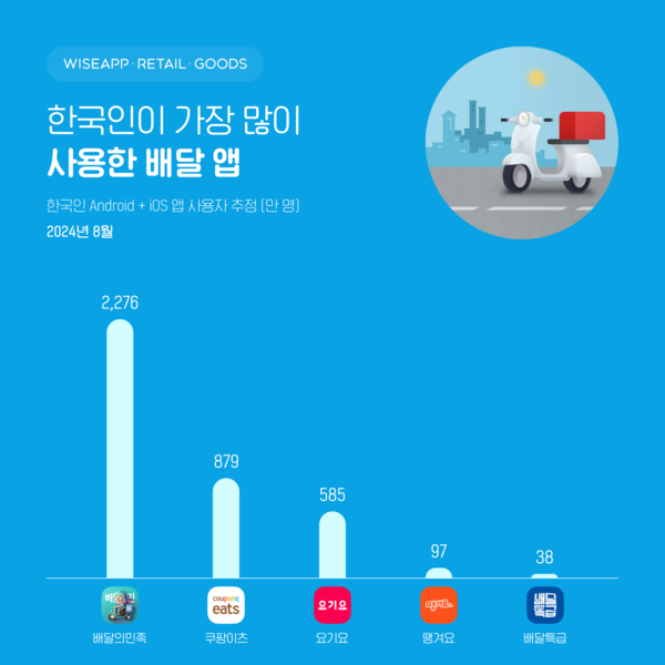 지난 8월 한국인이 가장 많이 사용한 배달 앱은 배달의민족으로 월간 사용자 수가 2,276만 명이었다. 그 뒤로 쿠팡이츠 879만 명, 요기요 585만 명, 땡겨요 97만 명, 배달특급 38만 명 순이었다.