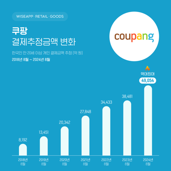와이즈앱·리테일·굿즈가 만 20세 이상 한국인이 신용카드, 체크카드, 계좌이체, 소액결제 등으로 결제한 금액을 표본 조사한 결과, 쿠팡의 24년 8월 결제추정금액은 4조 9,054억 원으로 역대 최대치를 기록했다. 이는 전년 동월 3조 8,481억 원 대비 27% 증가한 수치다.