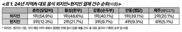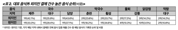 강릉(순두부)의 경우 '물회' 및 '닭강정'을 판매 중인 식당에서 외지인이 결제한 건수가 현지인 대비 각각 3.0배, 7.2배 이상 높았다. 제주(돼지고기), 대구(치킨), 담양(떡갈비) 지역 내'국수'와 관련된 결제 건수 역시 현지인 대비 최대 5.1배 이상 높았다.