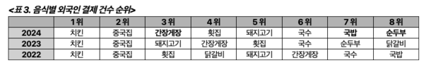 기간內 외국인 결제 건수 중 가장 많았던 음식은 '치킨'… '간장게장', '국수', '국밥' 등 전통 한식 순위도 올라