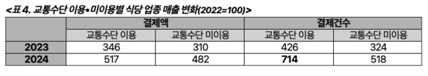 한국 전통 음식에 대한 관심도 증가는 해당 음식이 유명한 지역을 외국인이 직접 찾아가 소비하는 현상으로 이어졌다. 최근 3년간 국내 교통수단(고속버스, 철도, 렌터카)을 이용한 외국인이 15개 지역 내 식당 업종에서 결제한 금액 및 건수는 교통수단을 이용하지 않은 외국인 보다 50%가량 높은 수치를 기록했다.