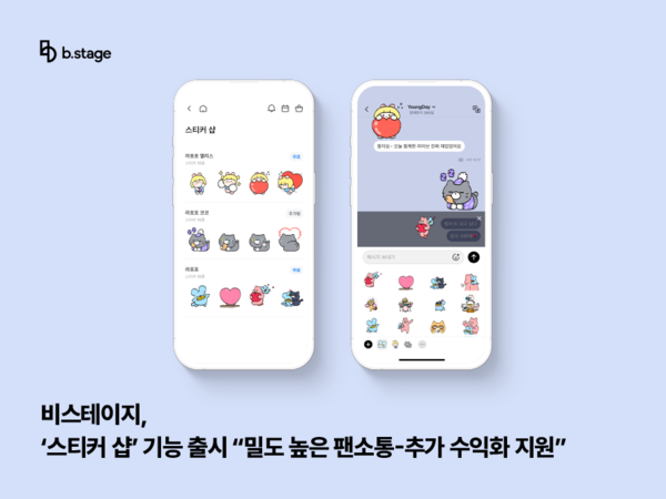글로벌 팬덤 비즈니스 토탈 솔루션 ‘비스테이지(b.stage)’가 실시간 양방향 소통 기능 ‘비스테이지 팝(b.stage POP)’에 ‘스티커(이모티콘) 샵’ 기능을 추가했다고 11일 밝혔다.