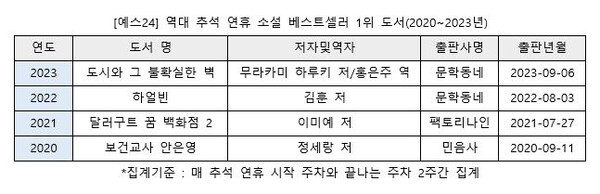 역대 추석 연휴 소설 베스트셀러 1위에는 ▲무라카미 하루키의 <도시와 그 불확실한 벽>(2023) ▲김훈 작가의 <하얼빈>(2022) ▲이미예 작가의 <달러구트 꿈 백화점2>(2021) ▲정세랑 작가의 <보건교사 안은영>(2020)이 올랐다.