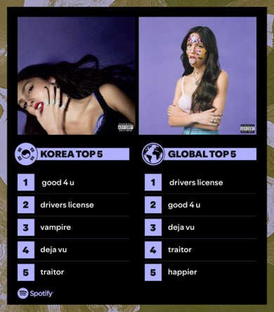이와 더불어 한국을 포함한 전 세계에서 가장 많이 스트리밍된 트랙 순위도 공개했다. 세계적으로 가장 많이 스트리밍된 올리비아 로드리고의 곡은 “drivers license”인 것으로 집계됐으며, “good 4 u”, “deja vu”, “traitor”, “happier”가 그 뒤를 이었다.