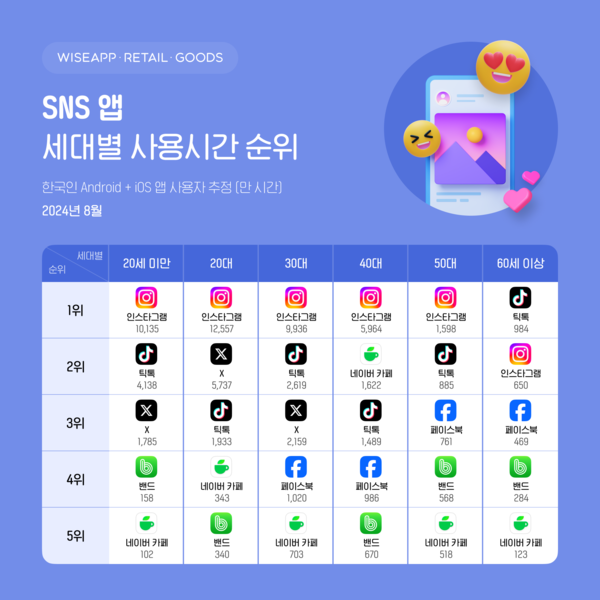 와이즈앱·리테일·굿즈가 한국인 스마트폰 사용자(Android+iOS)를 표본 조사한 결과, 24년 8월 세대별SNS 사용자 순위는 30대 이하 연령에서는 인스타그램이 1위, 40대 이상 연령에서는 밴드가 1위를 차지했다.