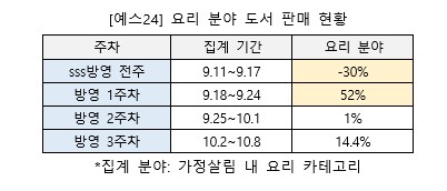 또 최강록 셰프와 ‘트리플스타’ 강승원 셰프가 외부 인터뷰에서 요리 시작의 계기가 된 만화로 밝힌 <미스터 초밥왕>도 9월에 전월 대비 84.3% 판매가 상승했다. 이외에도 요리 만화를 찾는 독자들로 인해 요리 분야 만화책이 방영 첫 주에 판매량이 16% 증가하기도 했다.