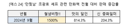 ‘흑백요리사’는 만화책의 인기에도 영향을 주고 있다. 흑수저 요리사로 출연한 조광효 셰프는 만화책에서 영감을 받아 요리를 시작했다는 특별한 스토리로, 일명 ‘만찢남’으로 불리며 화제를 모았다. 특히 조광효 셰프가 영감을 받았다며 직접 언급한 만화책들은 해당 회차 이후 판매가 증가하고 있다.