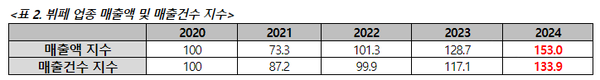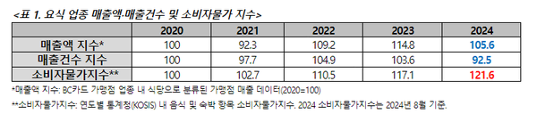 통계청에 따르면 올해 8월 소비자물가지수는 122를 기록했지만, 같은 기간 내 BC카드의 요식 업종 매출액 지수는 106으로 나타나는 등 큰 차이도 확인됐다.(2020=100). 전체 요식업 매출은 더딘 성장세를 기록했지만, 뷔페 업종에서의 매출액 및 매출건수는 연평균 8.9%, 10.2%씩 성장하는 등 비교적 높은 증가세를 이어갔다.(표 2. 참고)