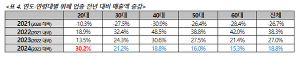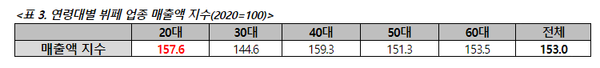 이 가운데 Z세대(1990년대 중후반~2010년대 초반 출생자)로 분류되는 20대 고객의 매출액 지수는 평균보다 높은 수치를 기록했다.(표 3. 참고)