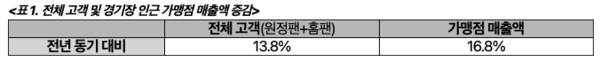 BC카드에 따르면 올해 경기장을 찾은 고객은 전년 동기 대비 13.8% 증가했고, 경기장 인근 가맹점 매출은 전년 동기 대비 16.8% 올랐다.(표 1. 참고)