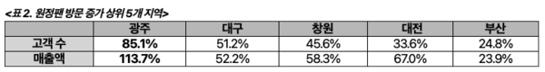 정규 시즌에서 1위를 기록한 기아 타이거즈(광주)와 2위를 기록한 삼성 라이온즈(대구) 경기장을 방문한 원정팬 숫자는 전년 동기 대비 각각 85.1%, 51.2% 증가했고, 이들이 인근 가맹점에서 소비한 금액도 각각 113.7%, 52.2% 증가했다.(표 2. 참고)