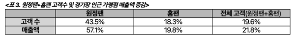 원정팬 규모 및 경기장 인근 가맹점에서 사용한 매출은 전년 동기 대비 각각 44.6%, 57.0% 증가했다. 이는 전체 고객 대비 각각 23.9%p, 35.4%p 높은 수치다.(표 3. 참고)