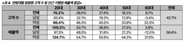 전년 동기 대비 원정팬 매출 분석 결과 20대 관중이 모든 연령대 중 가장 큰 증가세를 기록하는 등 1천만 관중 돌파에 크게 기여한 것이 확인됐다. 특히, 20대 여성 원정팬이 경기장 인근에서 소비한 금액은 전년 동기 대비 2배 이상 증가했다.(표 4. 참고)