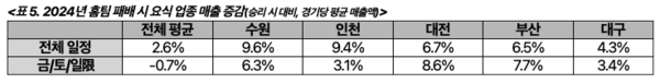 한편, 전년 동기 대비 경기가 있는 날 경기장 인근 가맹점 매출(16.1%↑)은 경기가 없는 날(1.4%↑) 보다 큰 폭으로 매출이 증가됐다. 또한, 올 한 해 홈팀의 승패 결과가 음식점, 치킨, 주점 등 경기장 인근 요식 업종 매출에도 큰 영향을 끼치고 있는 것도 확인됐다.(표 5. 참고, 무승부는 패배 결과로 포함)