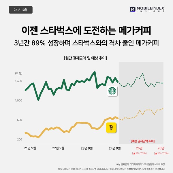 스타벅스에 도전하는 메가커피, 3년간 89% 성장하며 스타벅스와의 격차 줄이고 있어
