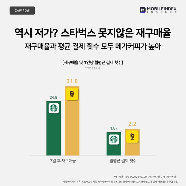 메가커피, 스타벅스 못지않은 재구매율... 재구매율과 평균 결제 횟수 모두 메가커피가 높아