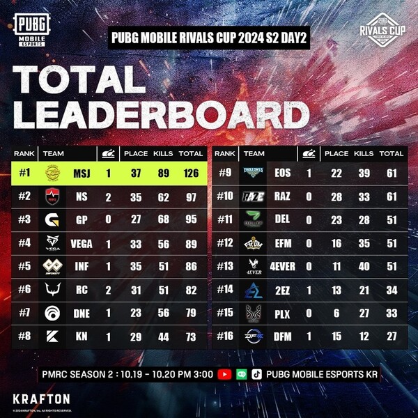 하루 6매치씩 총 12개의 매치를 치른 결과, 한국의 미래엔세종이 총 1치킨, 126포인트로 대회 우승을 차지했다. 미래엔세종은 1일 차 44포인트로 5위에 머물렀으나, 2일 차 3개 매치에서 무려 63포인트를 쓸어 담는 무서운 집중력을 발휘하며 1위에 올라섰다.