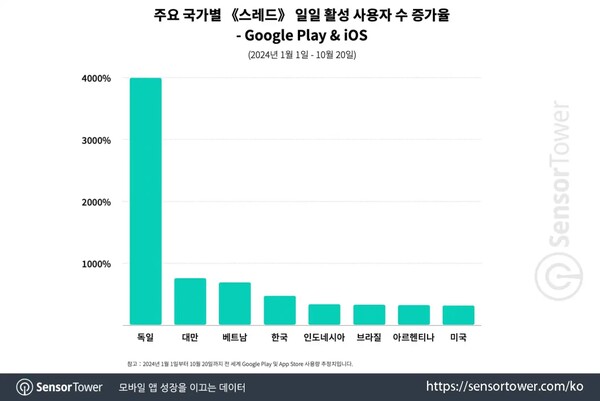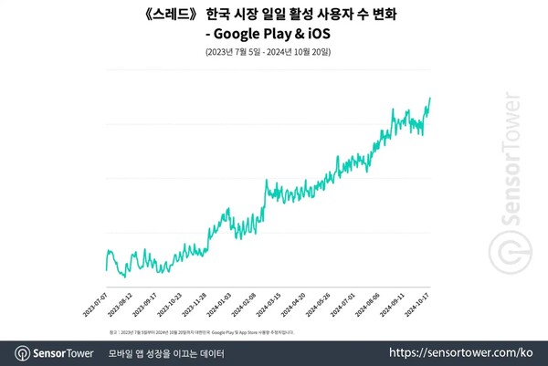 2024년 10월 20일, 성장세 속 《스레드》는 한국 시장에서 DAU 최고치를 경신했습니다.