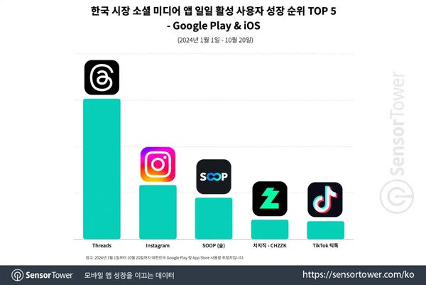 《스레드》, 한국 시장 소셜 미디어 앱 중 다운로드 성장 2위, 일일 활성 사용자 성장 1위