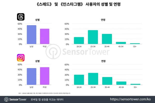 이러한 중복성에도 불구하고 《인스타그램》과 《스레드》는 연령대와 성비에서 차이를 보입니다. 《인스타그램》 사용자의 경우 남성 48.7%, 여성 51.3%로 성비가 거의 균등하지만, 《스레드》 사용자는 남성 비율이 55.2%로 여성 비율 44.8%보다 높습니다.