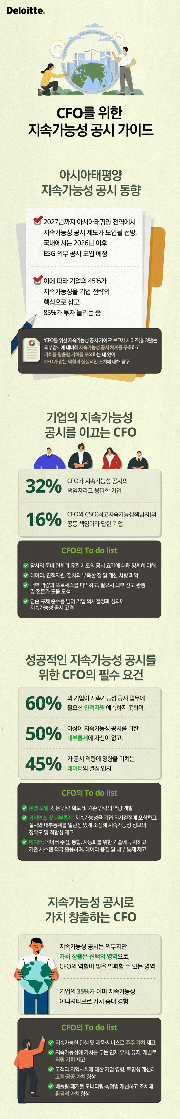 지속가능성 공시는 기업 연간 재무제표 준비 수준의 엄격성이 필수기에 관련 역량을 가진 CFO의 역할이 특히 중요해지고 있다. 딜로이트 조사에 따르면 응답자의 32%가 CFO를 지속가능성 공시 책임자로 지목했으며, 16%는 CFO와 CSO(최고지속가능성책임자)가 공동 책임을 진다고 응답했다.