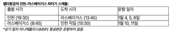 또한, 델타항공은 CES 2025 참가자들을 위해 인천-라스베이거스 노선에 특별 차터기를 운항한다. 델타는 지난 2년간 인천-라스베이거스 차터기를 운영해 CES 참가하는 한국 고객들에게 편리한 서비스를 제공해 왔다.