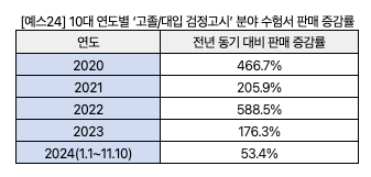 이러한 경향성에 따라 10대의 검정고시 관련 수험서 구매도 매년 꾸준히 늘었다. 10대의 ‘고졸/대입 검정고시’ 분야 수험서 판매 증감률은 2020년부터 4년간 세 자릿수 성장세를 기록했고, 올해에도 53.4% 판매가 증가했다. 10대의 2024년 수험서/자격증 분야 베스트셀러 10위권에도 <2024 에듀윌 고졸 검정고시 핵심총정리> 등 고졸/대입 검정고시 수험서가 6권이나 자리했다.