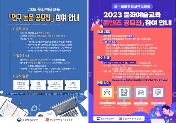 문화체육관광부(장관 박보균)와 한국문화예술교육진흥원(원장 박은실, 이하 교육진흥원)이 2023년 ‘문화예술교육 연구 논문 공모전’과 ‘문화예술교육 콘텐츠 공모전’을 개최한다.