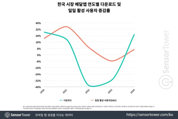센서타워 데이터에 따르면 코로나19 팬데믹에 폭발적으로 증가했던 한국 시장 배달앱의 다운로드 수는 2021년을 정점을 찍은 이후 감소세에 접어들었습니다. 그러나 2024년에는 전년 동기 대비 다운로드 수가 약 26% 증가했으며, 시장이 다시 회복되는 모습을 보이고 있습니다.