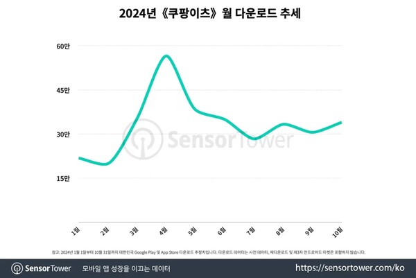 한국 시장 배달앱의 다운로드와 활성 사용자 수 회복세 속에 단연 눈에 띄는 앱은 《쿠팡이츠》입니다. 센서타워 데이터 기준, 2024년 4월 《쿠팡이츠》는 2022년 1월 이후 가장 높은 월간 다운로드 수인 약 60만 건을 기록했습니다.