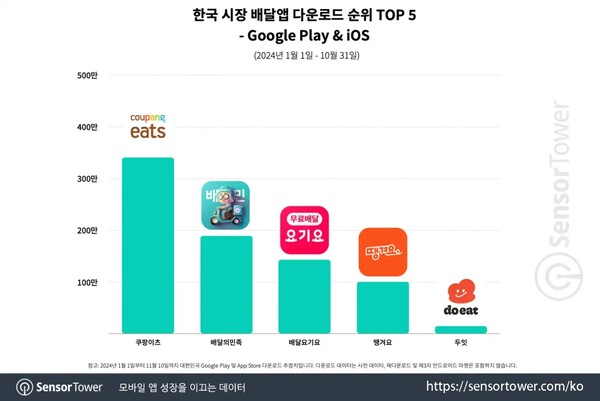 이러한 상승세 속에서 2024년 현재까지 《쿠팡이츠》는 한국 시장 배달앱 다운로드 수 1위에 올랐습니다. 2위인 《배달의민족》과는 다운로드 수에서 2배에 달하는 격차를 보였습니다.