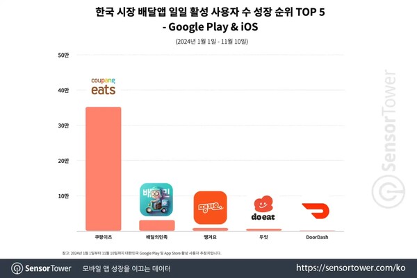 전년도와 비교하면 1위였던 《배달의민족》의 일일 활성 사용자 수는 《쿠팡이츠》 보다 약 7배 많았으나, 2024년에는 약 2.5배 차이로 줄어들며 《쿠팡이츠》의 성장세를 입증했습니다.