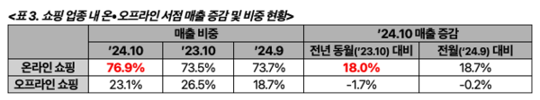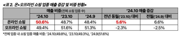 전년 동기 및 전월(9월) 기간 내 전체 쇼핑 업종에서의 온라인 쇼핑 비중은 48%대를 기록했지만, 10월 온라인 쇼핑 비중은 50.6%를 차지했다. 이는 전년 동기 및 전월 대비 각각1.9%p, 2.2%p 증가한 수치다.(표 2. 참고)