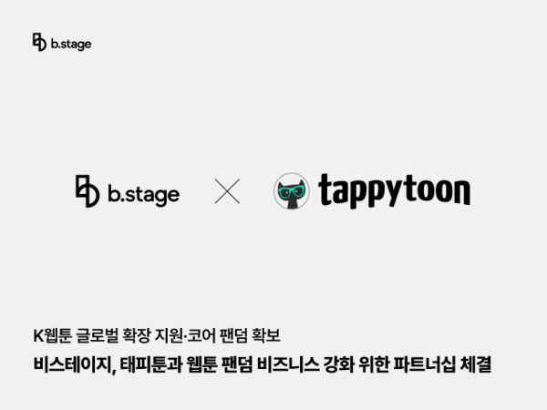 팬덤 비즈니스 토탈 솔루션 ‘비스테이지(b.stage)’가 글로벌 웹툰 플랫폼 ‘태피툰(Tappytoon)’과 전략적 파트너십을 맺고 K-웹툰의 글로벌 진출 확대 및 웹툰 팬덤 비즈니스 강화에 나선다. 비스테이지는 K-POP, e스포츠, 크리에이터 등 다양한 분야에서 성공적으로 팬덤 비즈니스를 전개한 경험과 노하우를 바탕으로 팬덤 비즈니스 영역을 웹툰까지 확대한다는 방침이다.