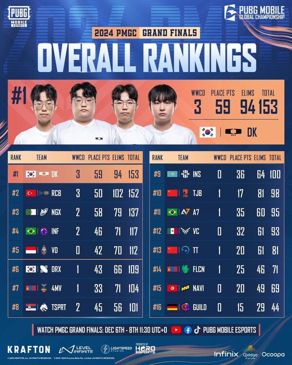 ㈜ 크래프톤(대표 김창한)이 배틀그라운드 모바일의 최상위 국제 e스포츠 대회인 ‘2024 배틀그라운드 모바일 글로벌 챔피언십(2024 PUBG MOBILE Global Championship, 이하 2024 PMGC)’이 한국의 디플러스 기아의 우승으로 성황리에 마쳤다.