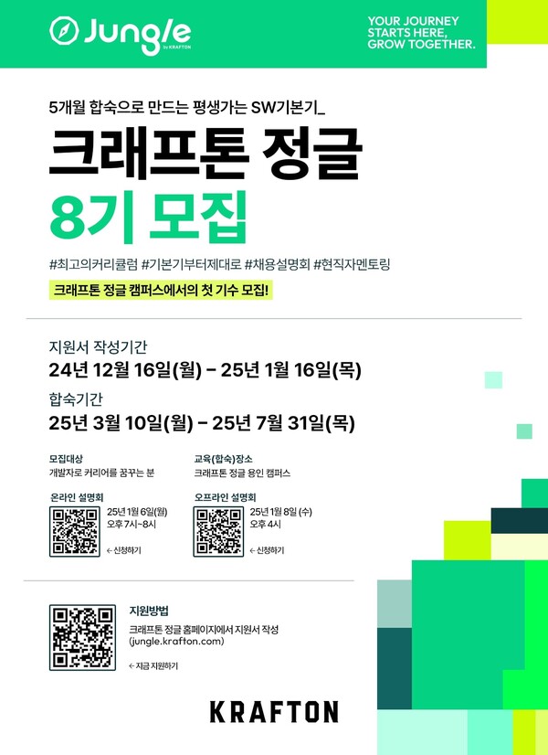 ㈜크래프톤(대표 김창한)이 디지털 인재 양성 프로그램 ‘크래프톤 정글’의 8기 참가자를 모집한다.