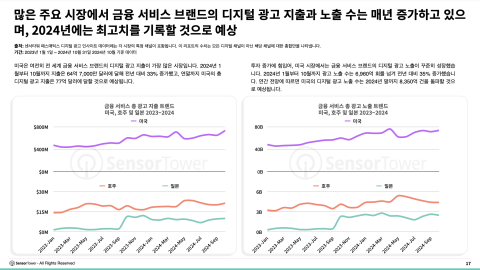 전 세계에서 금융 서비스 브랜드가 진행한 디지털 광고를 살펴봐도 상승 트렌드를 확인할 수 있다. 미국은 여전히 전 세계 금융 서비스 브랜드의 디지털 광고 지출이 가장 많은 시장이었다. 2024년 1월부터 10월까지 지출은 64억7000만달러에 달해 전년 대비 33% 증가했고, 연말까지 미국의 총 디지털 광고 지출은 77억달러에 달할 것으로 예상된다.
