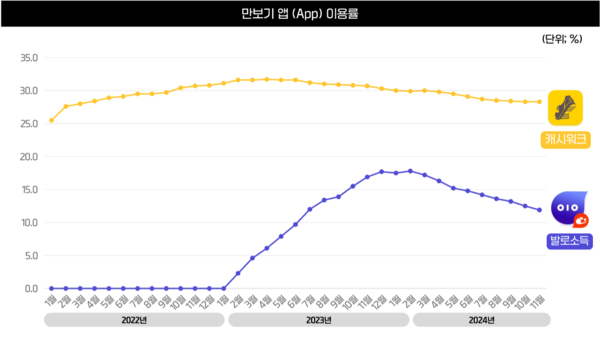 하지만 올해 11월 기준 ‘캐시워크’ 이용률이 다소 둔화되고, ‘발로소득’의 이용자 수가 전년 동기 대비 소폭 하락(19.4%)하는 등 성장세가 주춤한 모습을 보인 점이 주목할 만하다. 단순한 시스템만으로는 이용자들의 지속적인 관심을 유지하기에 어려움이 있음을 짐작해 볼 수 있는 대목으로, ‘만보기’ 앱이 지속 가능한 성장을 이루기 위해서는 ‘피크민 블룸’과 같이 이용자 경험에 새로운 가치를 더할 수 있는 콘텐츠 개발이 필요할 것으로 보인다.